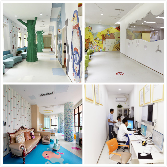 卡通式装修风格,整洁、舒适的就医环境。突出功能区分,配以符合儿童心理特征和身心特点的标识及设施设备,让患儿感到轻松、愉悦,在玩乐中就诊。